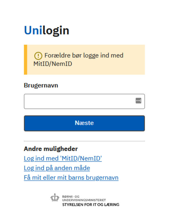 Har man glemt sit brugernavn til unilogin, kan man på loginsiden vælge "Få mit eller mit barns brugernavn"
