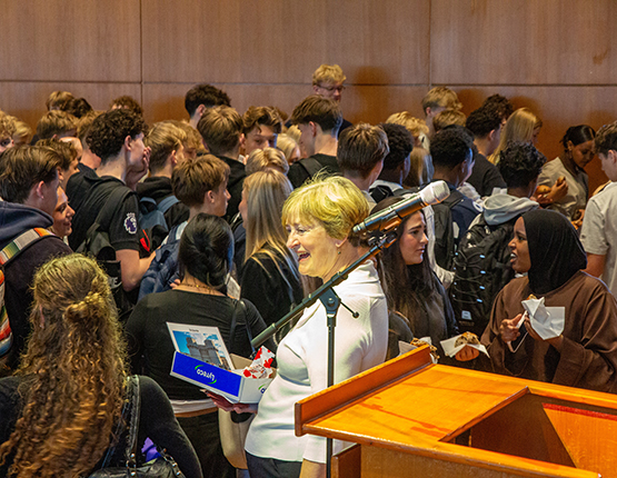 Der var sødt til maven og gode minder til hovedet, da retor Dorthe Fristrup sagde farvel til ÅSG's elever med 700 af kantinens sagnomspundne chokoladeboller.